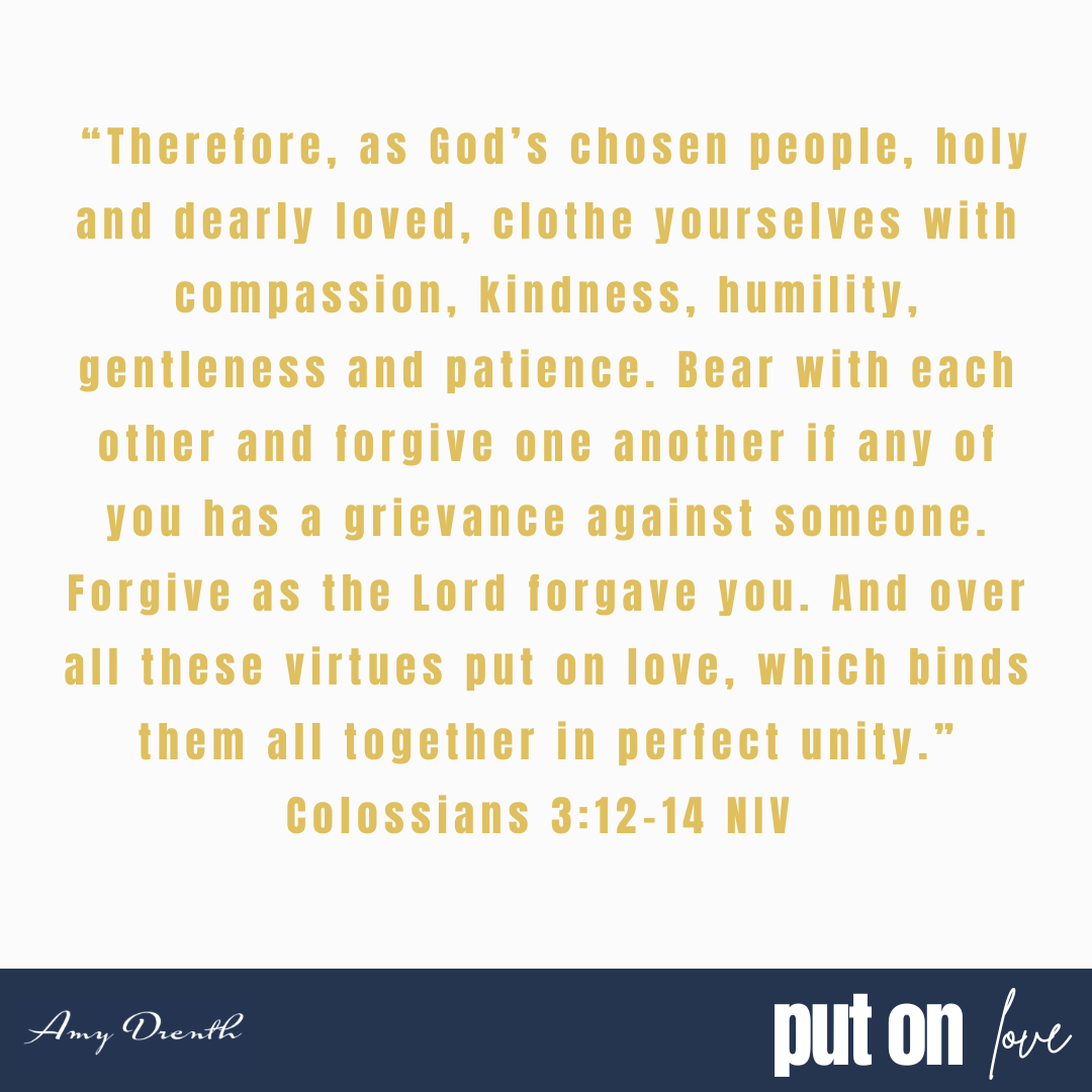 Friend, are you dressing yourself in love? We won’t get this perfect. We are far from “perfect love.” We are going to screw up by shaming ourselves. We will mistakenly desire the world more than God. We will forget the unmet measure of God’s forgiveness for our sins neglecting to forgive a treasured loved one or even a stranger. We are going to screw up showing compassion to someone because we make it a chore. We are going to mess up the greatest commandments of all: to love God and love our neighbor as we love ourselves.